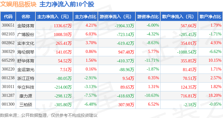 从资金流向上来看,当日文娱用品板块主力资金净流出7319.78万元,游资资金净流出3264.93万元,散户资金净流入1.06亿元。文娱用品板块个股资金流向见下表: