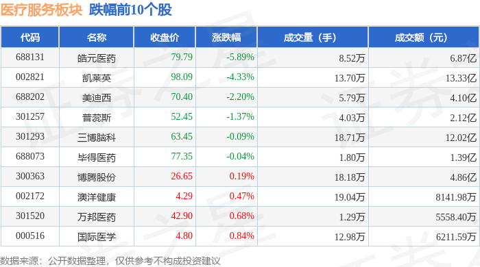 证券之星消息,10月31日医疗服务板块较上一交易日上涨1.67%,海特生物领涨。当日上证指数报收于3954.79,下跌0.81%。深证成指报收于13378.21,下跌1.14%。医疗服务板块个股涨跌见下表: