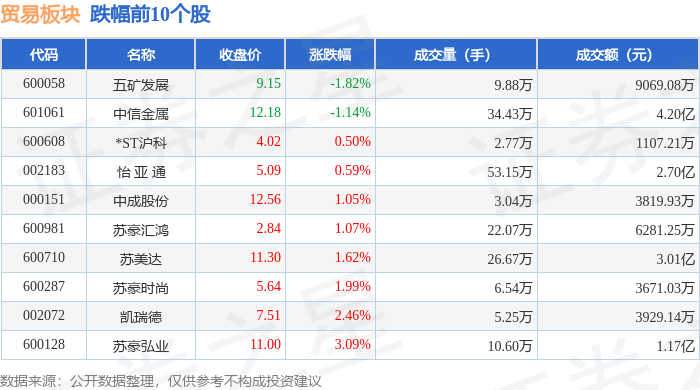 证券之星消息,10月31日贸易板块较上一交易日上涨2.01%,江苏国泰领涨。当日上证指数报收于3954.79,下跌0.81%。深证成指报收于13378.21,下跌1.14%。贸易板块个股涨跌见下表: