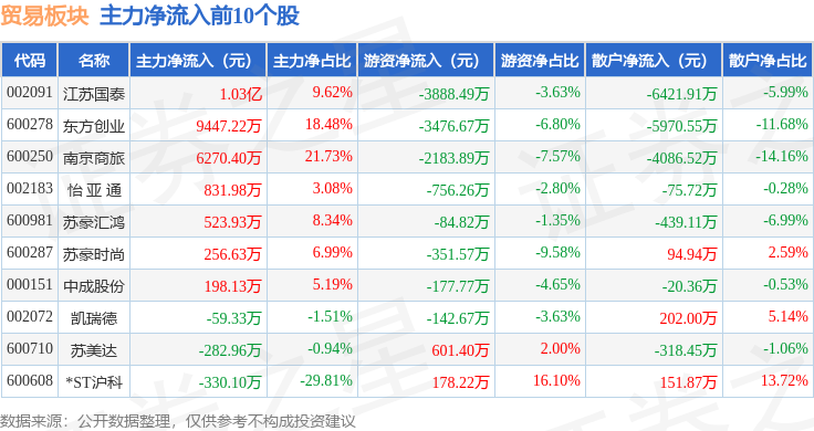 从资金流向上来看,当日贸易板块主力资金净流入2.31亿元,游资资金净流出1.18亿元,散户资金净流出1.13亿元。贸易板块个股资金流向见下表: