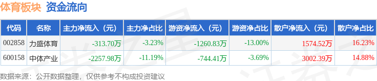 从资金流向上来看,当日体育板块主力资金净流出2571.67万元,游资资金净流出2005.23万元,散户资金净流入4576.91万元。体育板块个股资金流向见下表: