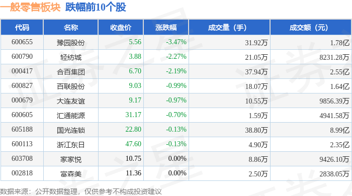 从资金流向上来看,当日一般零售板块主力资金净流入3.61亿元,游资资金净流出3.26亿元,散户资金净流出3461.2万元。一般零售板块个股资金流向见下表: