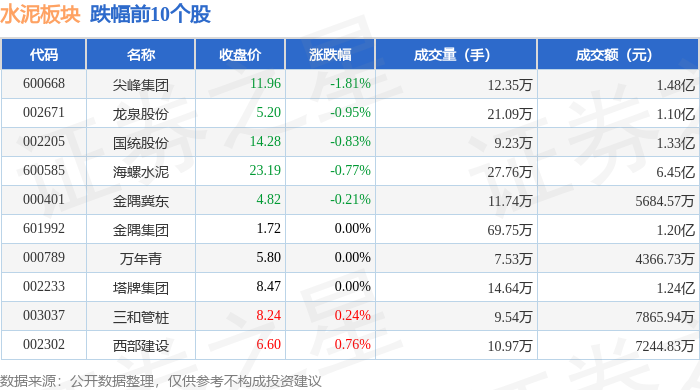 证券之星消息,10月31日水泥板块较上一交易日上涨0.82%,西藏天路领涨。当日上证指数报收于3954.79,下跌0.81%。深证成指报收于13378.21,下跌1.14%。水泥板块个股涨跌见下表: