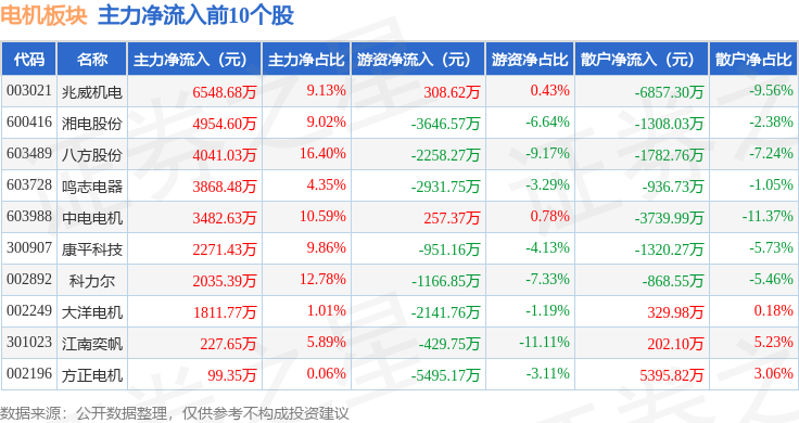从资金流向上来看,当日电机板块主力资金净流出6.36亿元,游资资金净流出541.88万元,散户资金净流入6.41亿元。电机板块个股资金流向见下表: