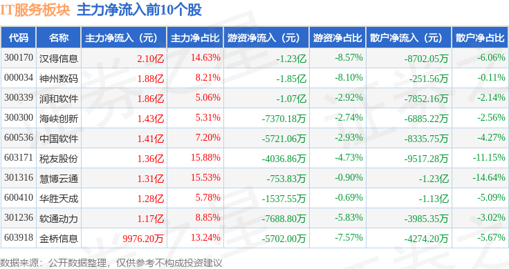 从资金流向上来看,当日IT服务板块主力资金净流入10.14亿元,游资资金净流出15.54亿元,散户资金净流入5.4亿元。IT服务板块个股资金流向见下表: