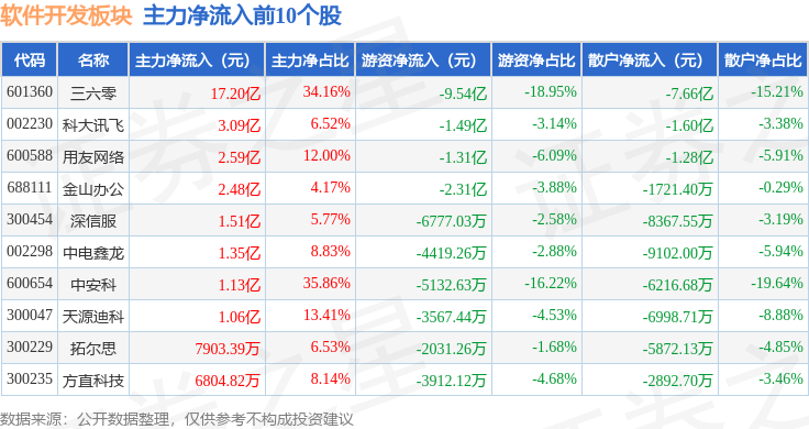 从资金流向上来看,当日软件开发板块主力资金净流入21.14亿元,游资资金净流出22.71亿元,散户资金净流入1.58亿元。软件开发板块个股资金流向见下表: