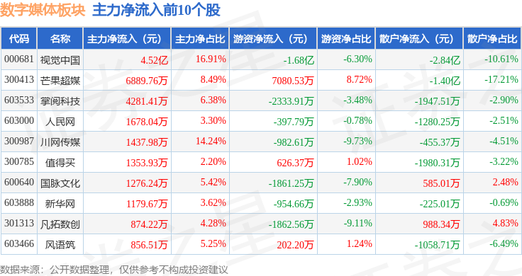 从资金流向上来看,当日数字媒体板块主力资金净流入6.5亿元,游资资金净流出1.96亿元,散户资金净流出4.53亿元。数字媒体板块个股资金流向见下表: