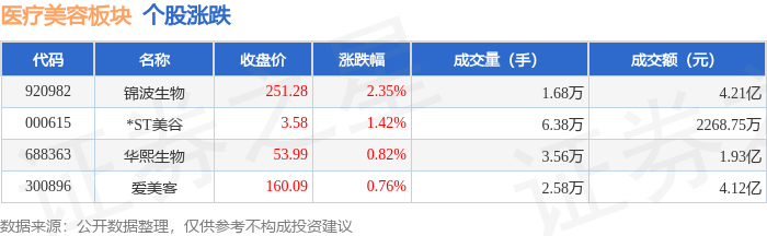 证券之星消息,10月31日医疗美容板块较上一交易日上涨0.81%,锦波生物领涨。当日上证指数报收于3954.79,下跌0.81%。深证成指报收于13378.21,下跌1.14%。医疗美容板块个股涨跌见下表: