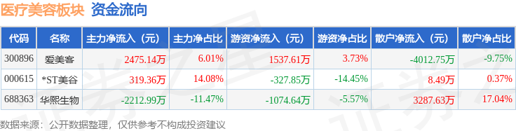 从资金流向上来看,当日医疗美容板块主力资金净流入581.51万元,游资资金净流入135.12万元,散户资金净流出716.63万元。医疗美容板块个股资金流向见下表: