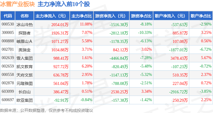 从资金流向上来看,当日冰雪产业板块主力资金净流出8512.62万元,游资资金净流出5400.03万元,散户资金净流入1.39亿元。冰雪产业板块个股资金流向见下表: