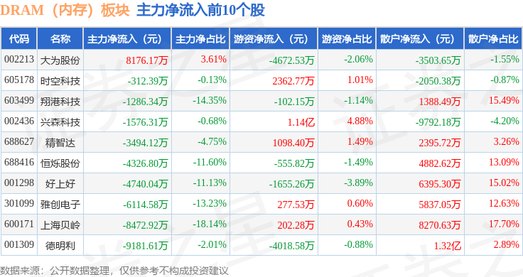 从资金流向上来看,当日DRAM(内存)板块主力资金净流出79.19亿元,游资资金净流入20.12亿元,散户资金净流入59.07亿元。DRAM(内存)板块个股资金流向见下表: