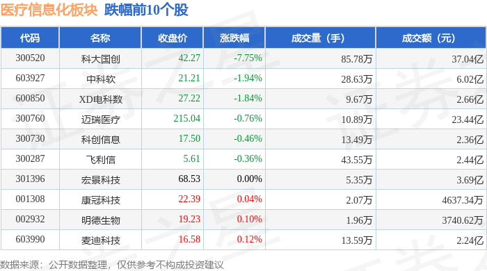证券之星消息,10月31日医疗信息化板块较上一交易日上涨1.52%,中安科领涨。当日上证指数报收于3954.79,下跌0.81%。深证成指报收于13378.21,下跌1.14%。医疗信息化板块个股涨跌见下表: