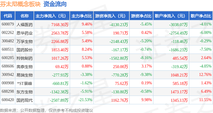 从资金流向上来看,当日芬太尼概念板块主力资金净流入1.02亿元,游资资金净流出7170.61万元,散户资金净流出2979.43万元。芬太尼概念板块个股资金流向见下表: