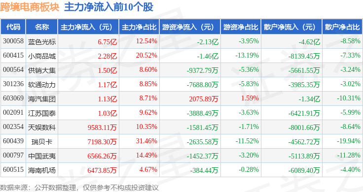 从资金流向上来看,当日跨境电商板块主力资金净流入7.39亿元,游资资金净流出9.98亿元,散户资金净流入2.59亿元。跨境电商板块个股资金流向见下表: