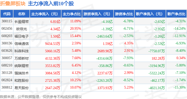 从资金流向上来看,当日折叠屏板块主力资金净流出9.9亿元,游资资金净流入9824.35万元,散户资金净流入8.92亿元。折叠屏板块个股资金流向见下表: