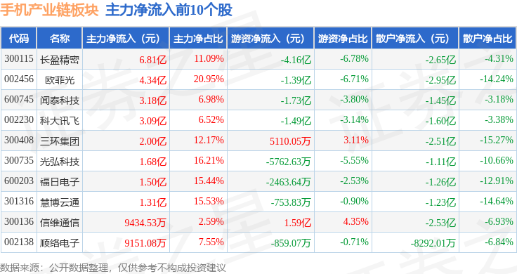 从资金流向上来看,当日手机产业链板块主力资金净流出82.48亿元,游资资金净流入17.42亿元,散户资金净流入65.06亿元。手机产业链板块个股资金流向见下表:
