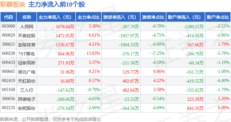 从资金流向上来看,当日彩票板块主力资金净流出8770.94万元,游资资金净流出1511.01万元,散户资金净流入1.03亿元。彩票板块个股资金流向见下表: