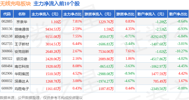 从资金流向上来看,当日无线充电板块主力资金净流出42.85亿元,游资资金净流入15.35亿元,散户资金净流入27.51亿元。无线充电板块个股资金流向见下表:
