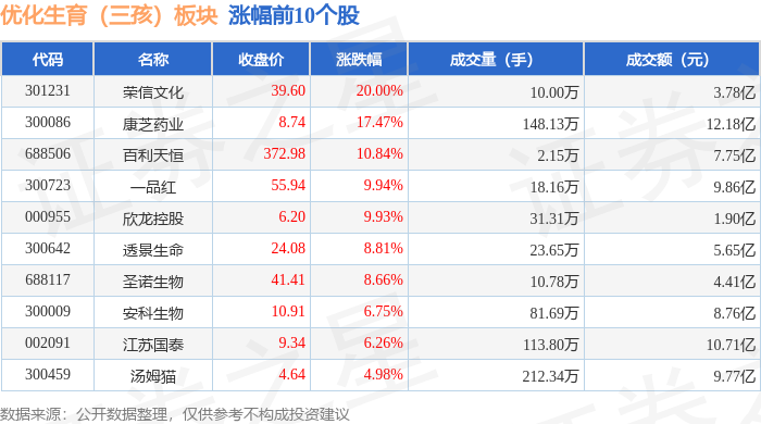 从资金流向上来看,当日优化生育(三孩)板块主力资金净流入5.64亿元,游资资金净流出9.98亿元,散户资金净流入4.34亿元。优化生育(三孩)板块个股资金流向见下表: