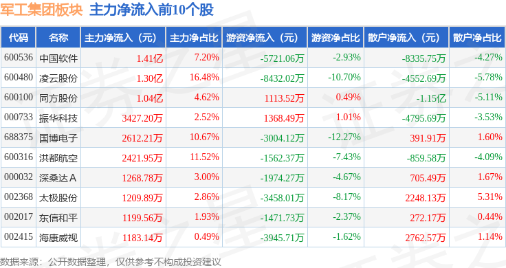 从资金流向上来看,当日军工集团板块主力资金净流出56.03亿元,游资资金净流入9.62亿元,散户资金净流入46.4亿元。军工集团板块个股资金流向见下表: