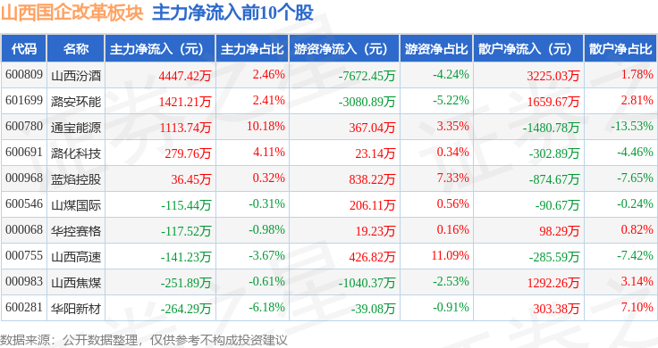 从资金流向上来看,当日山西国企改革板块主力资金净流出3.1亿元,游资资金净流出7098.49万元,散户资金净流入3.81亿元。山西国企改革板块个股资金流向见下表: