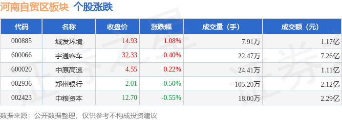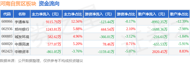从资金流向上来看,当日河南自贸区板块主力资金净流入1.07亿元,游资资金净流出1125.85万元,散户资金净流出9532.4万元。河南自贸区板块个股资金流向见下表: