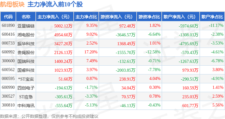 从资金流向上来看,当日航母板块主力资金净流出10.96亿元,游资资金净流入4.12亿元,散户资金净流入6.84亿元。航母板块个股资金流向见下表: