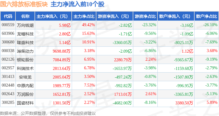 从资金流向上来看,当日国六排放标准板块主力资金净流入10.61亿元,游资资金净流出8.41亿元,散户资金净流出2.2亿元。国六排放标准板块个股资金流向见下表: