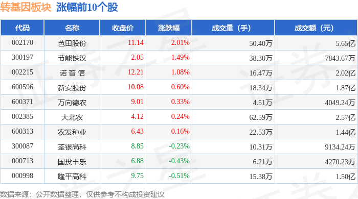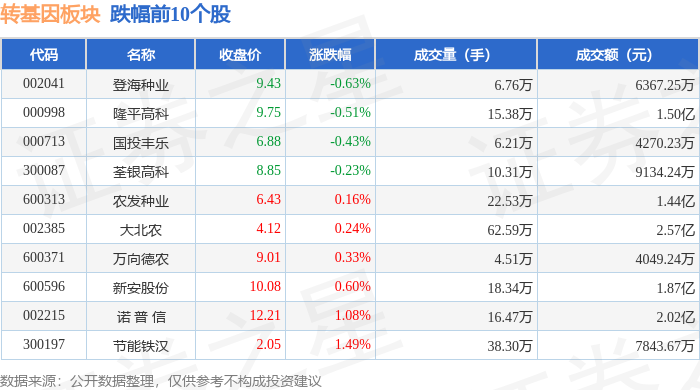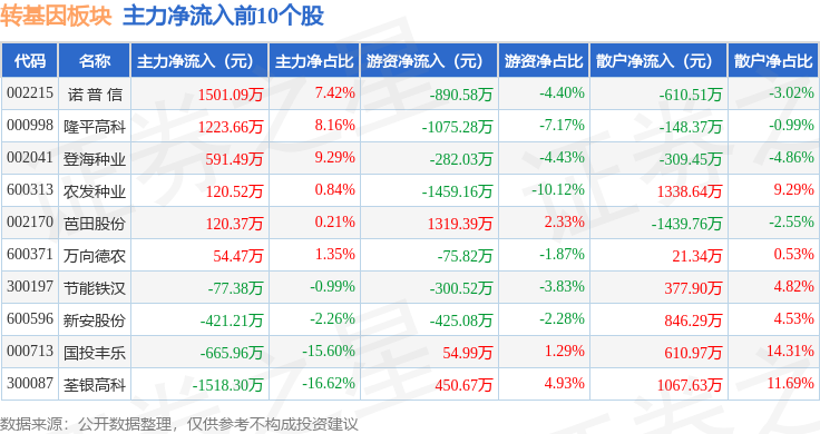 从资金流向上来看,当日转基因板块主力资金净流出1263.84万元,游资资金净流出2269.98万元,散户资金净流入3533.82万元。转基因板块个股资金流向见下表: