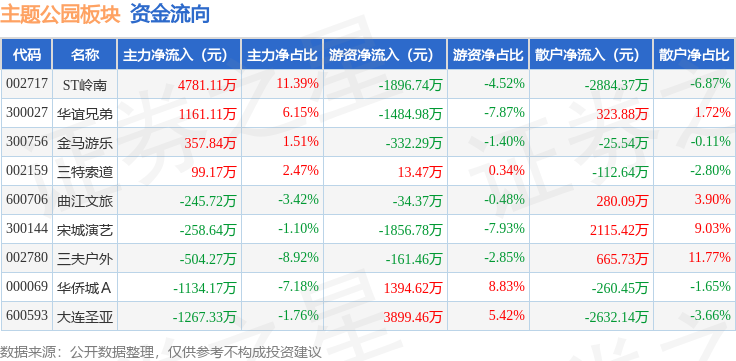从资金流向上来看,当日主题公园板块主力资金净流入2989.1万元,游资资金净流出459.08万元,散户资金净流出2530.01万元。主题公园板块个股资金流向见下表: