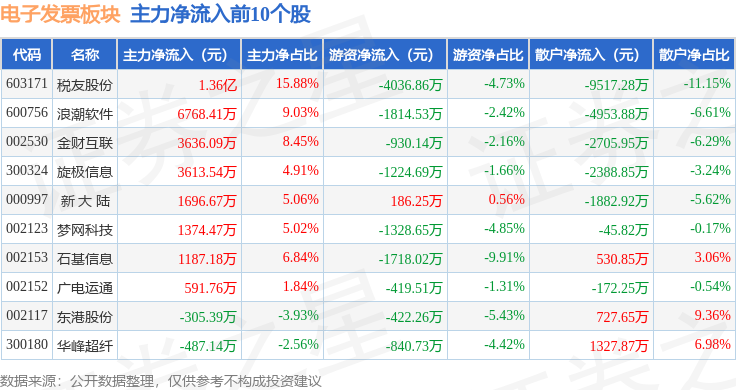 从资金流向上来看,当日电子发票板块主力资金净流出2.64亿元,游资资金净流出1.47亿元,散户资金净流入4.11亿元。电子发票板块个股资金流向见下表: