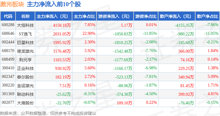 从资金流向上来看,当日激光板块主力资金净流出24.97亿元,游资资金净流入5.92亿元,散户资金净流入19.05亿元。激光板块个股资金流向见下表: