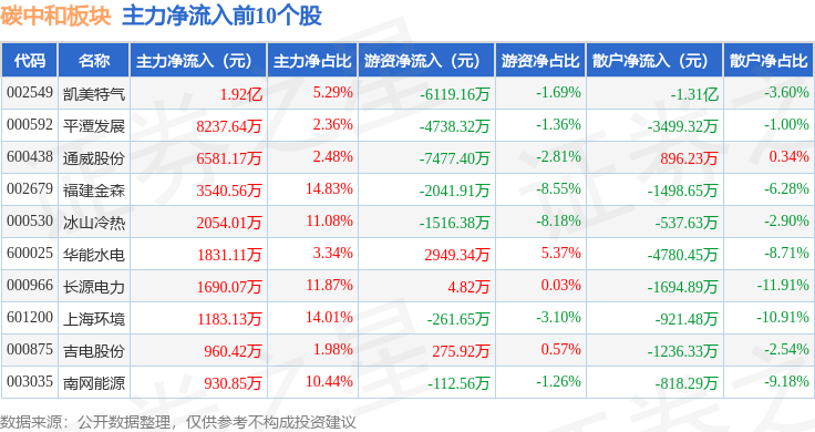 从资金流向上来看,当日碳中和板块主力资金净流出28.87亿元,游资资金净流入5.08亿元,散户资金净流入23.8亿元。碳中和板块个股资金流向见下表: