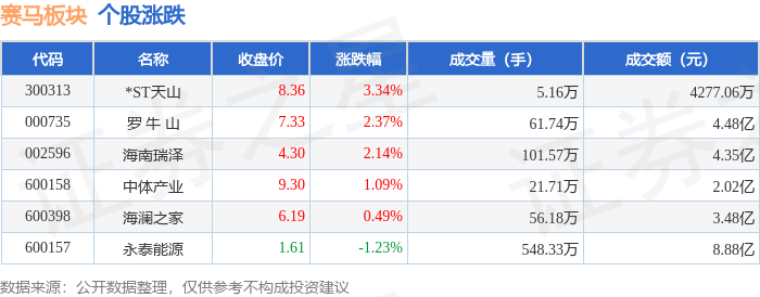 证券之星消息,10月31日赛马板块较上一交易日上涨0.17%,*ST天山领涨。当日上证指数报收于3954.79,下跌0.81%。深证成指报收于13378.21,下跌1.14%。赛马板块个股涨跌见下表: