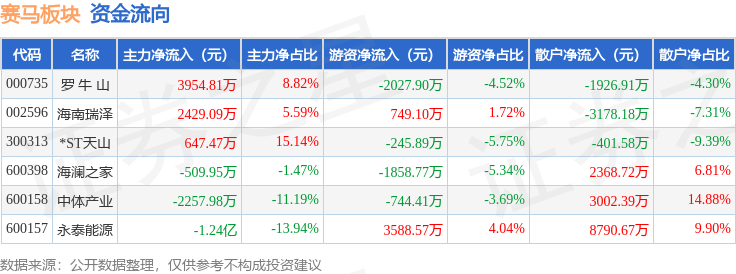 从资金流向上来看,当日赛马板块主力资金净流出8115.81万元,游资资金净流出539.3万元,散户资金净流入8655.11万元。赛马板块个股资金流向见下表: