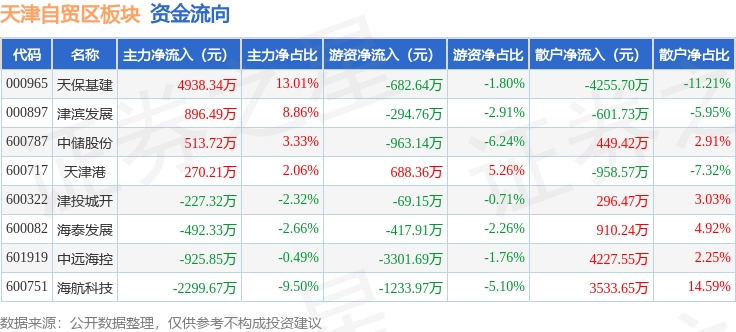 从资金流向上来看,当日天津自贸区板块主力资金净流入2673.59万元,游资资金净流出6274.9万元,散户资金净流入3601.32万元。天津自贸区板块个股资金流向见下表: