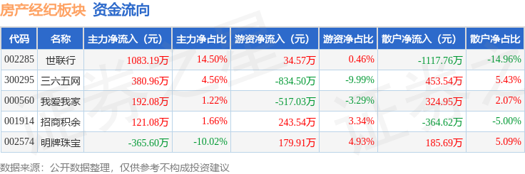 从资金流向上来看,当日房产经纪板块主力资金净流入1411.72万元,游资资金净流出893.51万元,散户资金净流出518.21万元。房产经纪板块个股资金流向见下表: