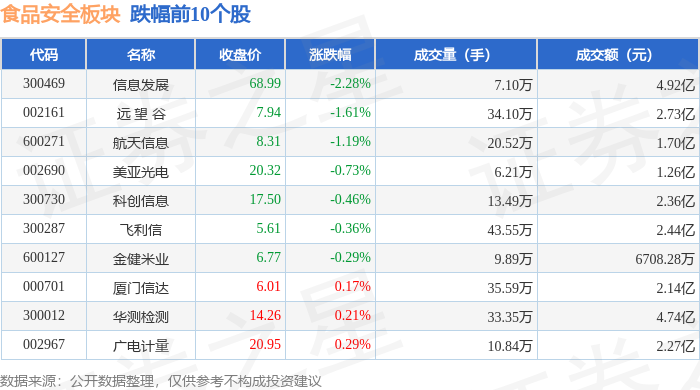 从资金流向上来看,当日食品安全板块主力资金净流入1.12亿元,游资资金净流出1.82亿元,散户资金净流入7002.24万元。食品安全板块个股资金流向见下表: