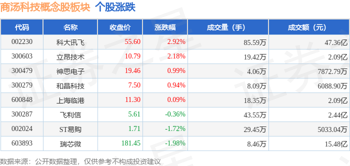 证券之星消息,10月31日商汤科技概念股板块较上一交易日上涨0.69%,科大讯飞领涨。当日上证指数报收于3954.79,下跌0.81%。深证成指报收于13378.21,下跌1.14%。商汤科技概念股板块个股涨跌见下表: