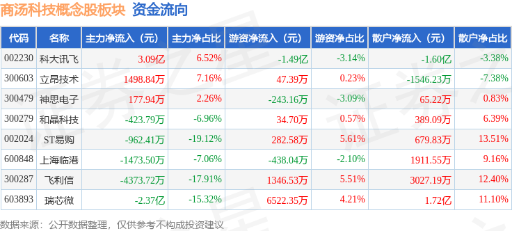 从资金流向上来看,当日商汤科技概念股板块主力资金净流入1611.06万元,游资资金净流出7332.92万元,散户资金净流入5721.86万元。商汤科技概念股板块个股资金流向见下表: