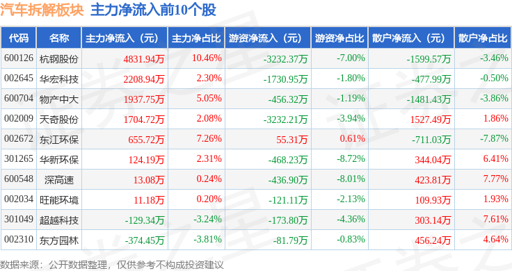 从资金流向上来看,当日汽车拆解板块主力资金净流出9805.02万元,游资资金净流出6301.29万元,散户资金净流入1.61亿元。汽车拆解板块个股资金流向见下表:
