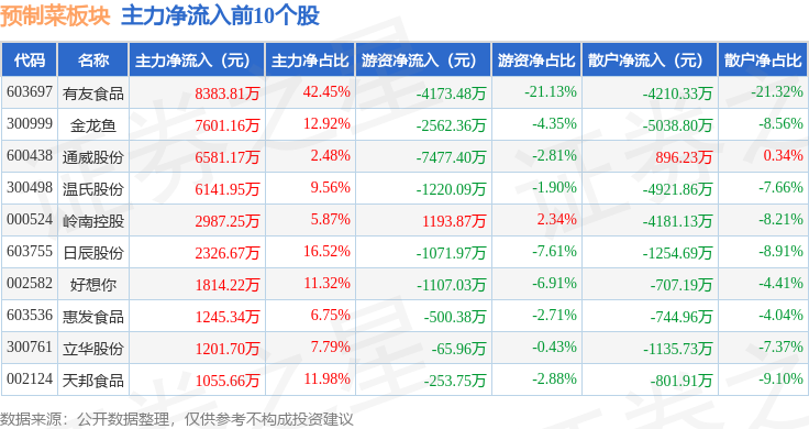 从资金流向上来看,当日预制菜板块主力资金净流入1.21亿元,游资资金净流出1.29亿元,散户资金净流入818.22万元。预制菜板块个股资金流向见下表: