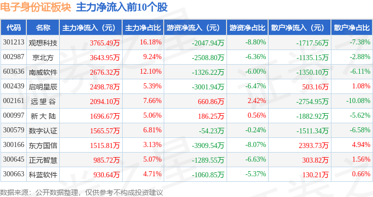 从资金流向上来看,当日电子身份证板块主力资金净流出1.38亿元,游资资金净流出1.94亿元,散户资金净流入3.33亿元。电子身份证板块个股资金流向见下表: