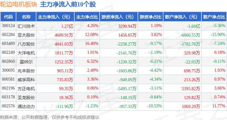 从资金流向上来看,当日轮边电机板块主力资金净流出1.44亿元,游资资金净流出5071.7万元,散户资金净流入1.94亿元。轮边电机板块个股资金流向见下表: