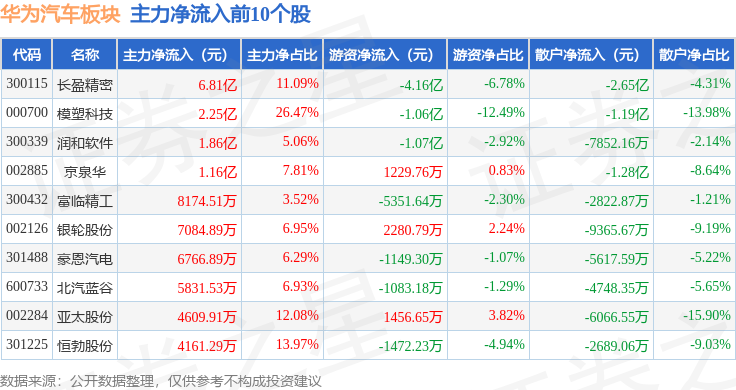 从资金流向上来看,当日华为汽车板块主力资金净流出29.33亿元,游资资金净流入1.85亿元,散户资金净流入27.48亿元。华为汽车板块个股资金流向见下表: