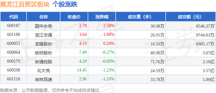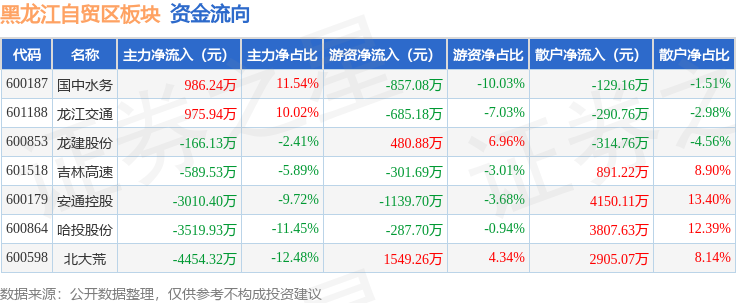 从资金流向上来看,当日黑龙江自贸区板块主力资金净流出9778.12万元,游资资金净流出1241.22万元,散户资金净流入1.1亿元。黑龙江自贸区板块个股资金流向见下表: