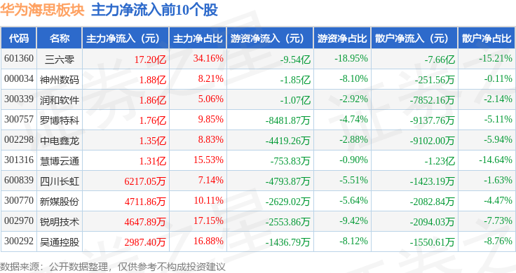从资金流向上来看,当日华为海思板块主力资金净流入8.81亿元,游资资金净流出13.36亿元,散户资金净流入4.55亿元。华为海思板块个股资金流向见下表: