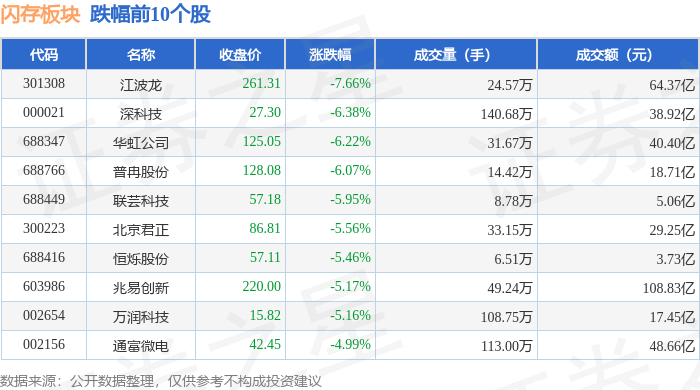 证券之星消息,10月31日闪存板块较上一交易日下跌3.75%,江波龙领跌。当日上证指数报收于3954.79,下跌0.81%。深证成指报收于13378.21,下跌1.14%。闪存板块个股涨跌见下表: