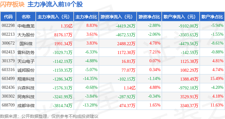 从资金流向上来看,当日闪存板块主力资金净流出65.1亿元,游资资金净流入12.73亿元,散户资金净流入52.37亿元。闪存板块个股资金流向见下表: