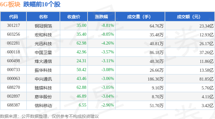 证券之星消息,10月31日6G板块较上一交易日下跌2.18%,铜冠铜箔领跌。当日上证指数报收于3954.79,下跌0.81%。深证成指报收于13378.21,下跌1.14%。6G板块个股涨跌见下表: